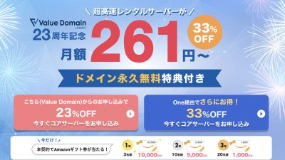Domain Hosting on2025-08-06097 views Value-Domain、23周年記念で最大33%割引キャンペーンを開催 Value-Domainは、23周年を記念して、非常に魅力的で包括的なキャンペーンを実施中です。期間は2025年8月1日14:00から8月31日23:59まで。これは、高性能なサーバーを手に入れるだけでなく、長期的なドメイン費用も節約できる絶好の機会です。これらの特別なオファーの詳細…