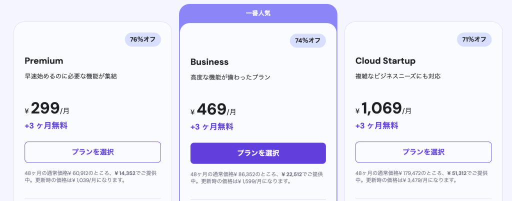 ホスティングプランを12ヶ月、24ヶ月、または48ヶ月で契約すると、大幅な割引が適用されます。以下は、主要なプランの価格と割引率をまとめたものです。